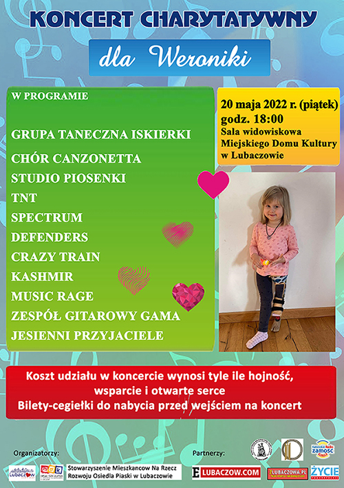 W piątek (20.05) w sali widowiskowej Miejskiego Domu Kultury w Lubaczowie odbędzie się koncert charytatywny dla Weroniki, która urodziła się ze skróconą o połowę lewą nóżką. Dziewczynka wkrótce wyleci na operację do USA.