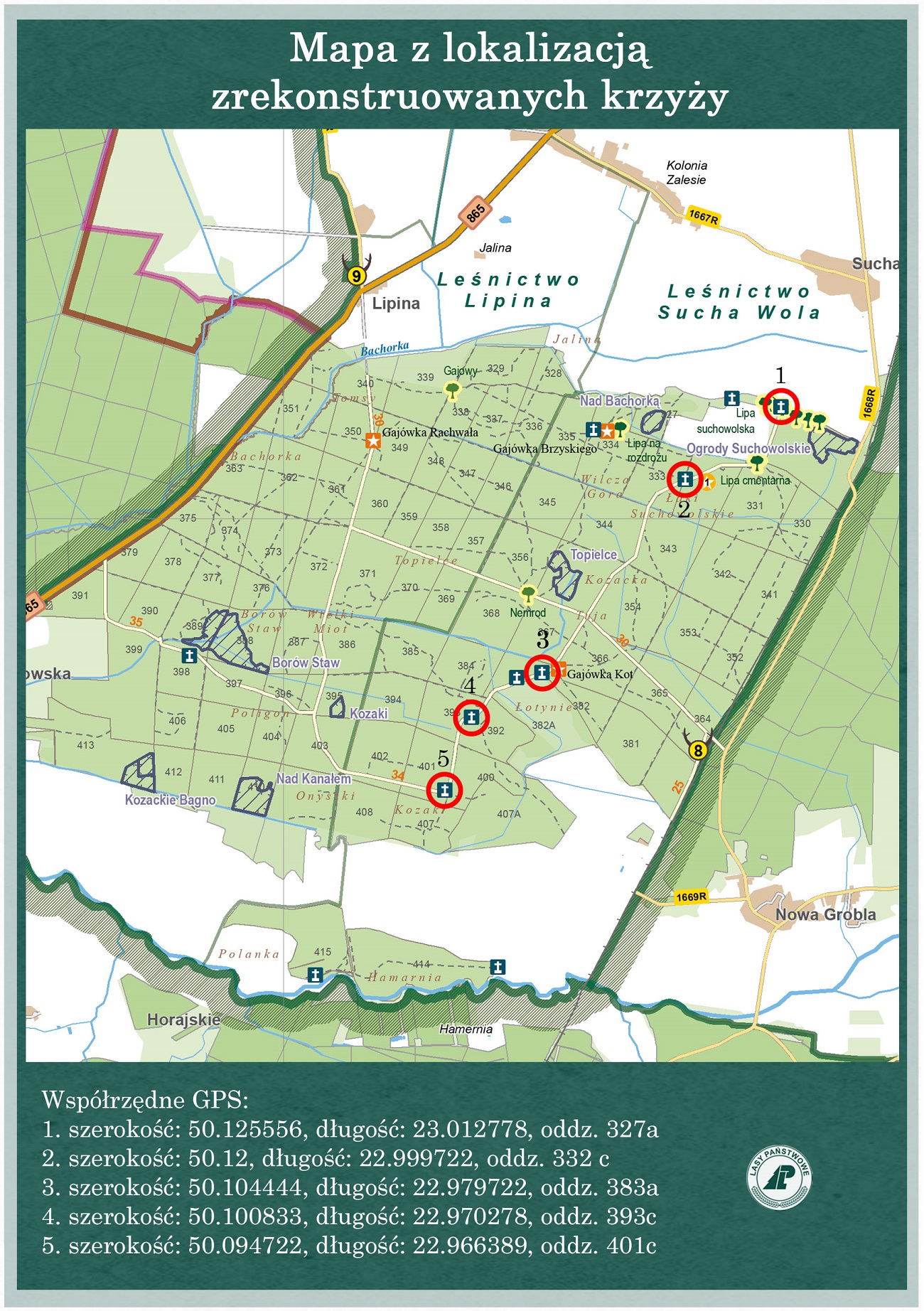 W krajobrazie kulturowym lasów lubaczowskich, na skrajach lasu, przy drogach, wśród pól występują liczne obiekty małej architektury sakralnej: kapliczki, krzyże i figury przydrożne. Spotkać je można również w lasach Nadleśnictwa Oleszyce, głównie przy drogach między nieistniejącymi dziś miejscowościami: Sucha Wola (pierwotna lokalizacja), Kozaki, Onyszki. Są znakami wiary i pobożności naszych przodków, są dziękczynne lub błagalne. Fundowane w dowód wdzięczności za doznane łaski, za uratowanie życia, za wybawienie od „głodu, ognia i wojny”, dla upamiętnienia ważnych wydarzeń. Są wyrazem podziękowania za uzdrowienie, odstąpienie chorób zakaźnych, narodziny dziecka, szczęśliwy powrót z Sybiru, z obozów koncentracyjnych i innych miejsc zesłania. Stoją jako wota błagalne: o urodzaj, pomyślność, jako wyraz pokuty, o ochronę przez złem. Stoją przy drogach naszych miejscowości, witając i żegnając mieszkańców i przybyszów.