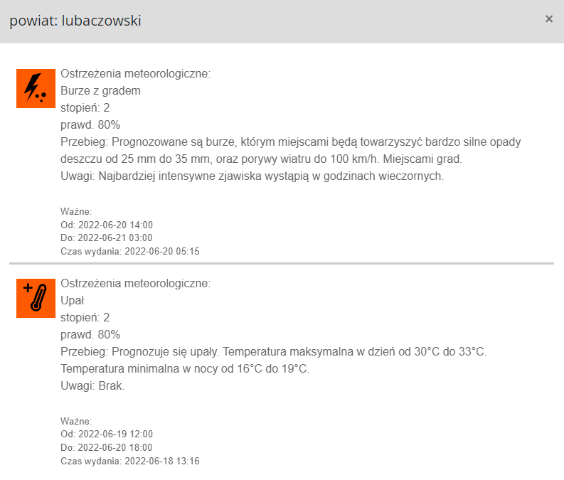 Instytut Meteorologii i Gospodarki Wodnej ostrzega, że na terenie powiatu lubaczowskiego mogą wystąpić burze z gradem. Wydano także ostrzeżenie dotyczące upału.