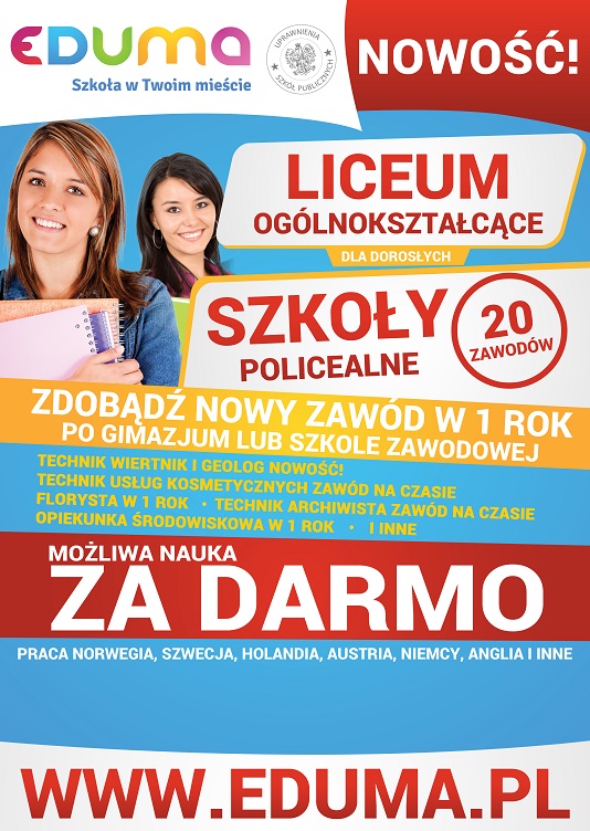 Nie zdałeś matury? Nic się nie stało! Masz maturę? To podnieś swoje kwalifikacje! Do 15 września trwa nabór do Szkoły Policealnej i Liceum EDUMA na specjalności: technik BHP, administracji, usług kosmetycznych, florystyka, opiekunka środowiska oraz wiele innych. Istnieje również możliwość nauki w Liceum Ogólnokształcącym dla dorosłych. Wszystko to za darmo, bo czesne wynosi 0 zł.