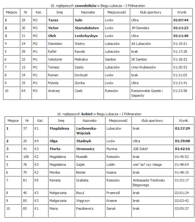Organizatorzy składają podziękowania uczestnikom, sponsorom i wszystkim osobom, które przyczyniły się do organizacji pierwszej edycji Biegu Lubacza – I Półmaratonu Lubaczowskiego.