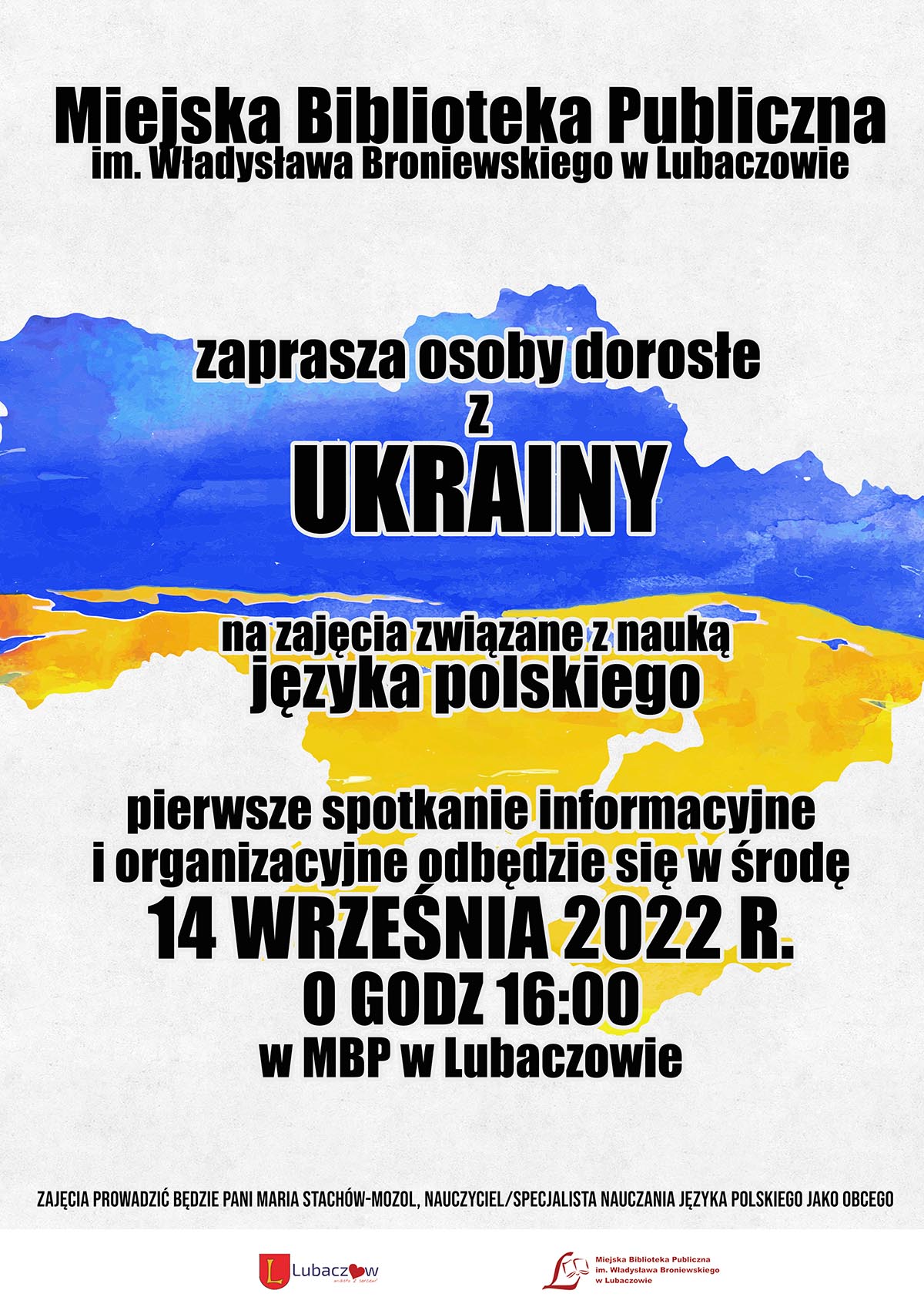 Spotkanie informacyjne i organizacyjne odbędzie się w środę 14 września o godz. 16:00 w MBP w Lubaczowie. Zajęcia prowadzić będzie pani Maria Stachów-Mozol, nauczyciel/specjalista nauczania języka polskiego jako obcego.
