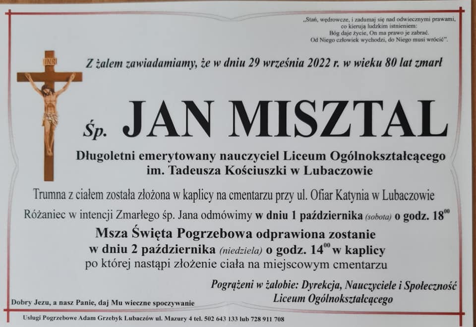 W piątek w wieku 80 lat zmarł Pan Profesor Jan Misztal, długoletni nauczyciel matematyki w Liceum Ogólnokształcącym im. Tadeusza Kościuszki w Lubaczowie, wiceprzewodniczący Rady Miasta Lubaczowa w lata 1998 – 2002, wicedyrektor Szkoły Podstawowej Nr 1 w Lubaczowie.