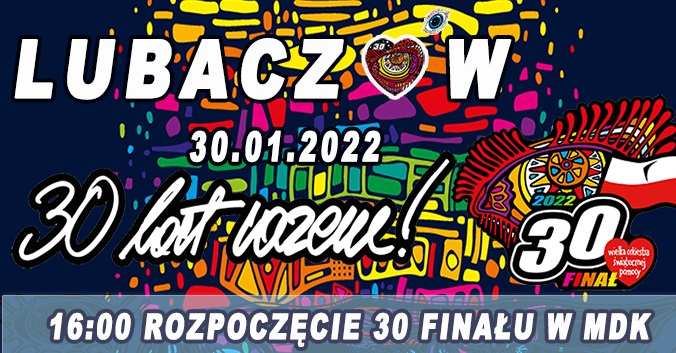 30 stycznia w niedzielę odbędzie się 30 finał Wielkiej Orkiestry Świątecznej Pomocy. W Lubaczowie impreza odbędzie się w sali Miejskiego Domu Kultury oraz na Rynku, gdzie o godz. 20:00 będzie światełko do nieba.