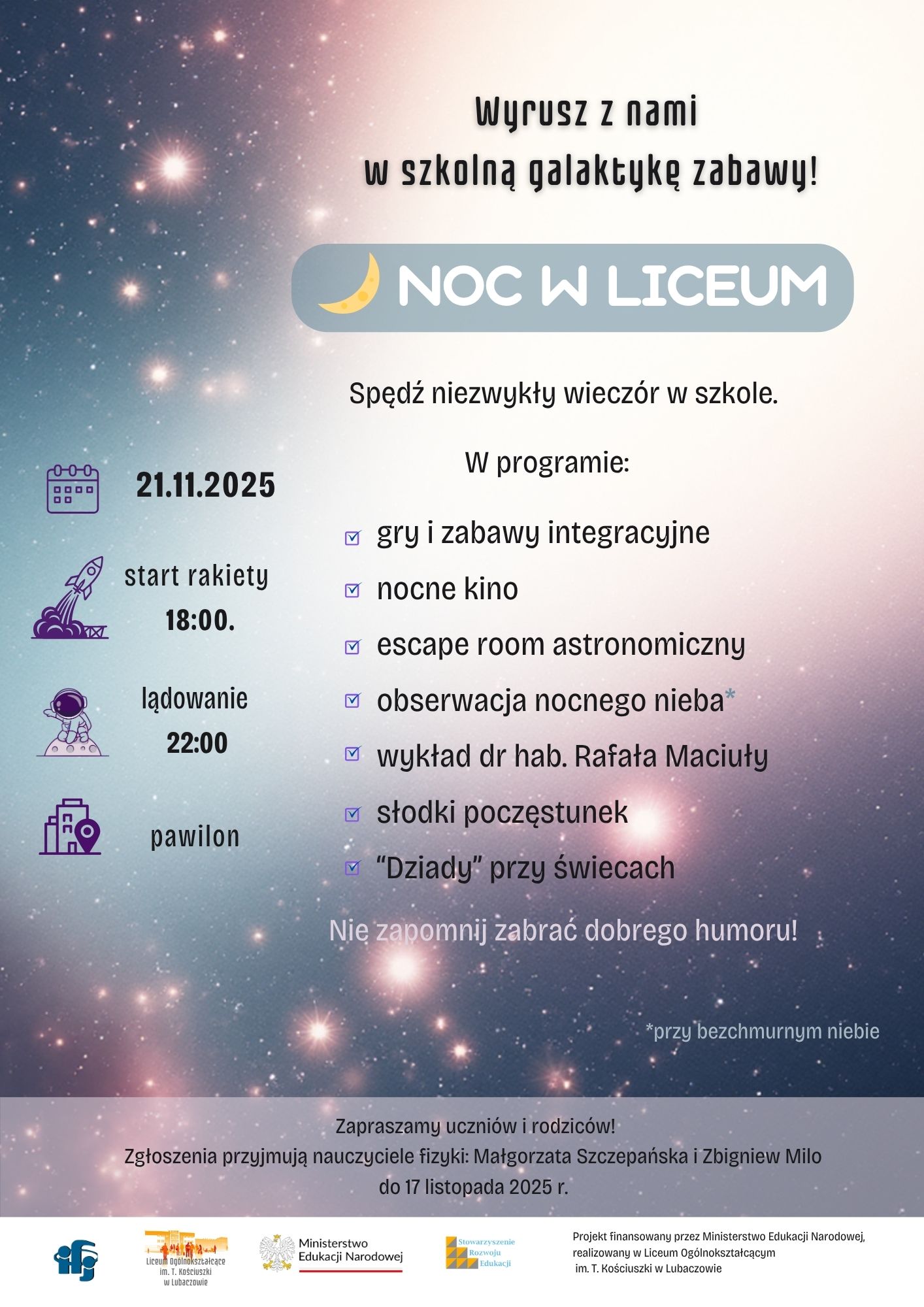 W Liceum Ogólnokształcącym im. Tadeusza Kościuszki w Lubaczowie szykuje się wyjątkowy wieczór. 21 listopada 2025 roku szkoła zamieni się w kosmiczną przestrzeń pełną atrakcji, a uczniowie i ich rodzice będą mogli wspólnie przeżyć „Noc w Liceum” – wydarzenie, które ma połączyć dobrą zabawę z edukacją i integracją.