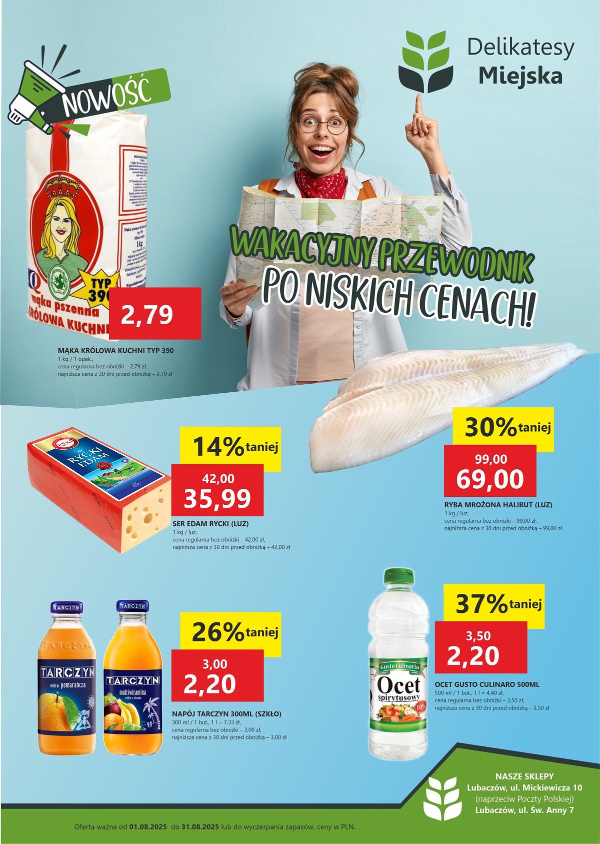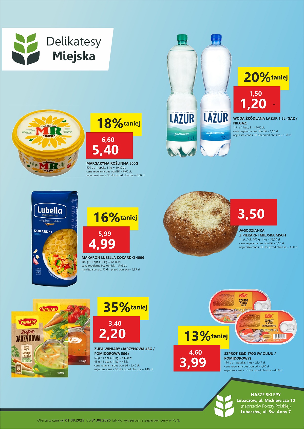 Promocje obowiązują od 1 do 31 sierpnia 2025 roku lub do wyczerpania zapasów. Sklepy Delikatesy Miejska znajdziesz w Lubaczowie przy ul. Mickiewicza 10 (naprzeciwko Poczty Polskiej) oraz przy ul. św. Anny 7.