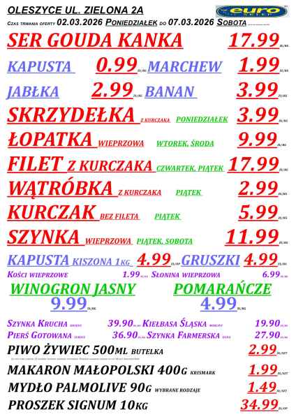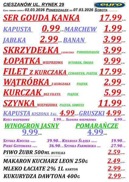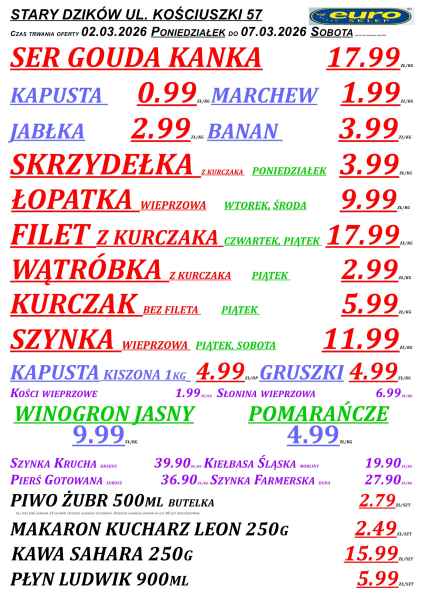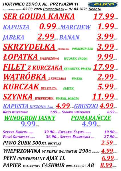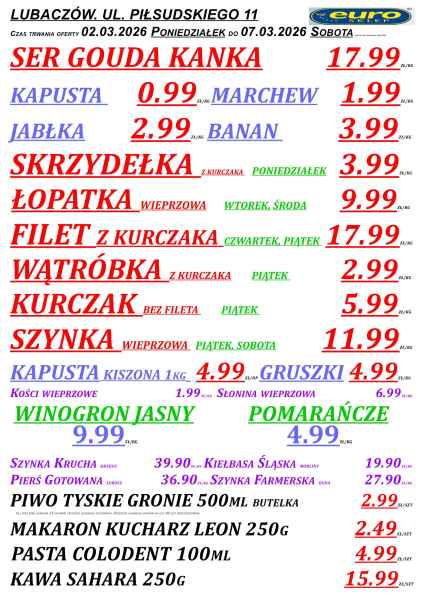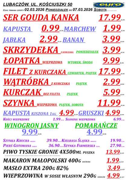 W sklepach Euro w powiecie lubaczowskim pojawiła się nowa gazetka promocyjna, która może zainteresować osoby planujące większe zakupy na początek marca. W ofercie znalazły się zarówno tanie warzywa od 0,99 zł za kilogram, jak i popularne rodzaje mięsa – w tym łopatka wieprzowa za 9,99 zł czy szynka wieprzowa za 11,99 zł. Do tego dochodzą promocje na nabiał, produkty suche i artykuły codziennego użytku.