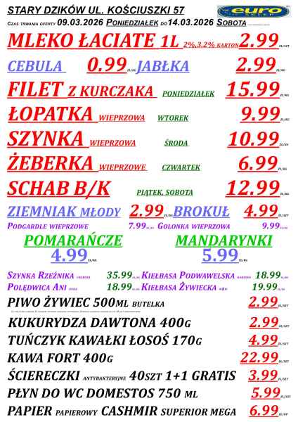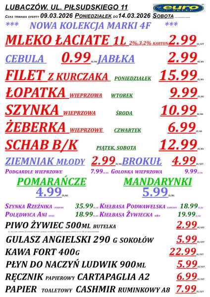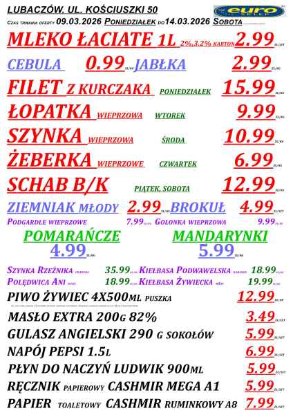 W sklepach Euro w powiecie lubaczowskim pojawiła się nowa gazetka promocyjna obowiązująca od 9 do 14 marca. W ofercie znalazło się wiele produktów codziennego użytku – od warzyw i owoców, przez mięso, aż po artykuły spożywcze i środki czystości.