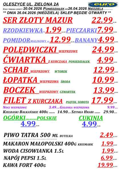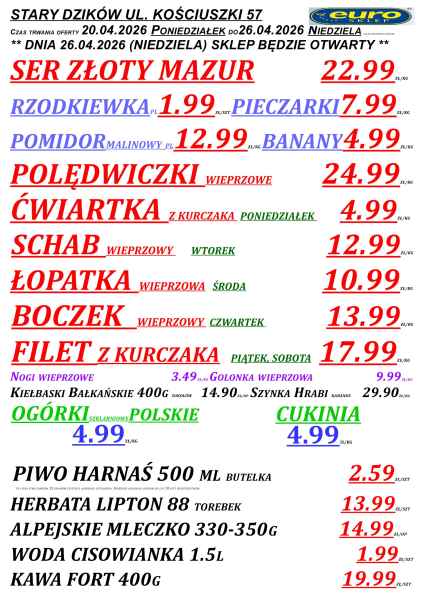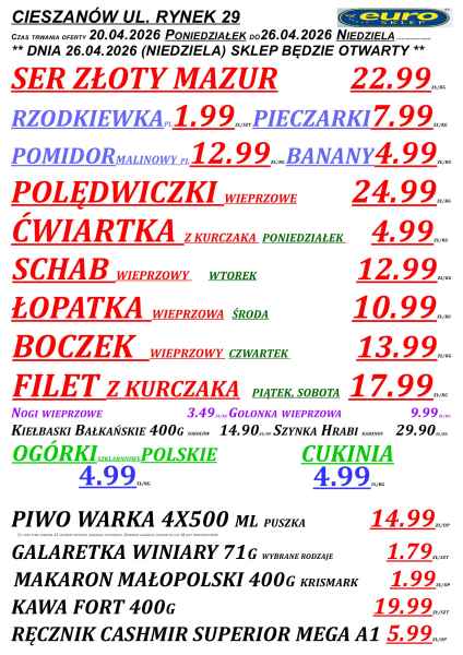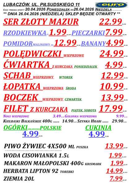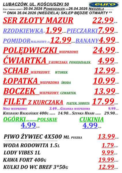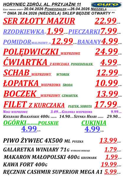 Gazetka obejmuje sklepy Euro m.in. w Lubaczowie, Cieszanowie, Oleszycach, Starym Dzikowie i Horyńcu-Zdroju. Promocje obowiązują do niedzieli lub do wyczerpania zapasów, a część z nich dostępna jest tylko w wybrane dni tygodnia.
