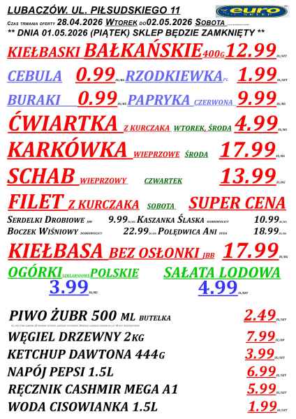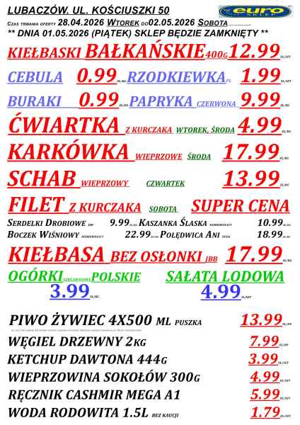 Nowa gazetka obowiązuje w sklepach Euro w Cieszanowie, Horyńcu-Zdroju, Lubaczowie, Oleszycach i Starym Dzikowie. Oferta potrwa do soboty, 2 maja, lub do wyczerpania zapasów. Warto pamiętać, że 1 maja sklepy będą zamknięte.