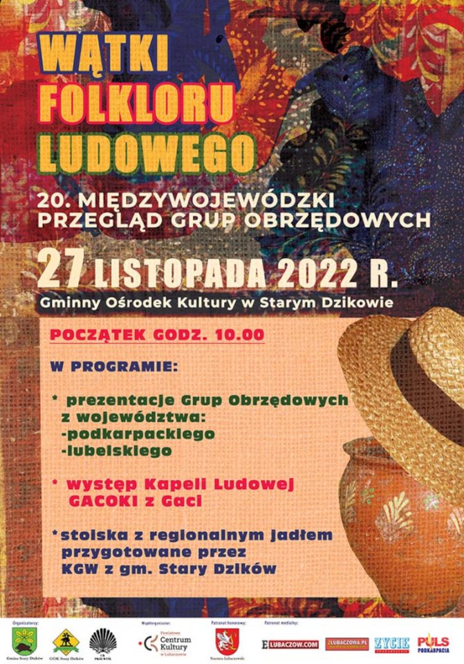Wydarzenie wystartuje w niedzielę (27.11) o godz. 10.00 w Gminnym Ośrodku Kultury w Starym Dzikowie. W programie prezentacje konkursowe grup obrzędowych, występ zaproszonego zespołu obrzędowego, wykład etnografa, podsumowanie prezentacji, wręczenie nagród.