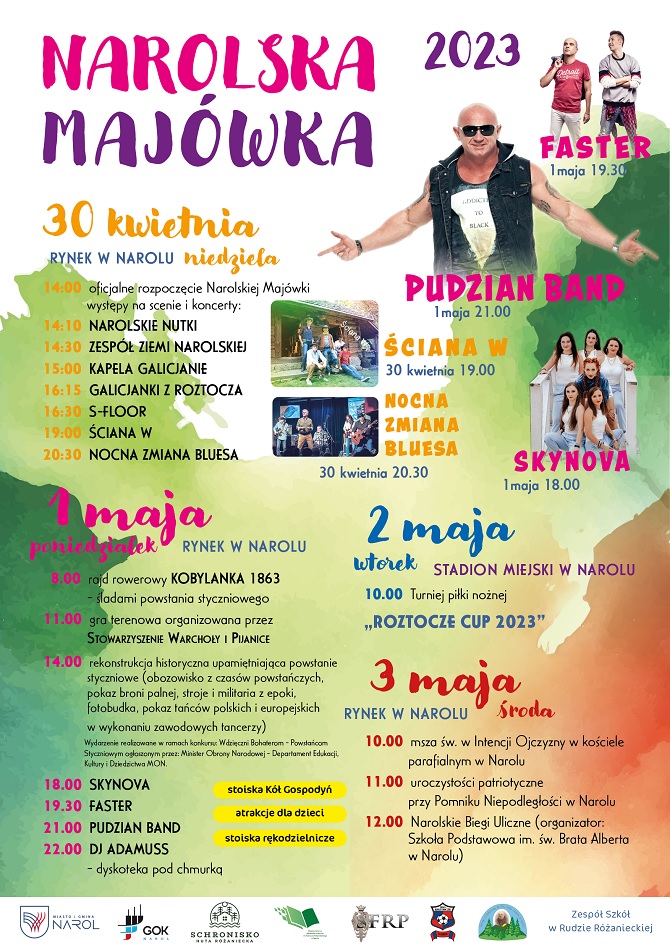 W niedzielę 30 kwietnia na rynku w Narolu wystąpią zespoły działające przy Gminnym Ośrodku Kultury w Narolu. Natomiast wieczorem zagrają zespoły: ŚCIANA W i NOCNA ZMIANA BLUESA.
