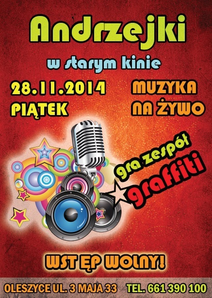 W piątek 28 listopada w „Hotelu w Starym Kinie” odbędzie się zabawa andrzejkowa. Do tańca przygrywał będzie zespół „Graffiti”. Wstęp wolny.