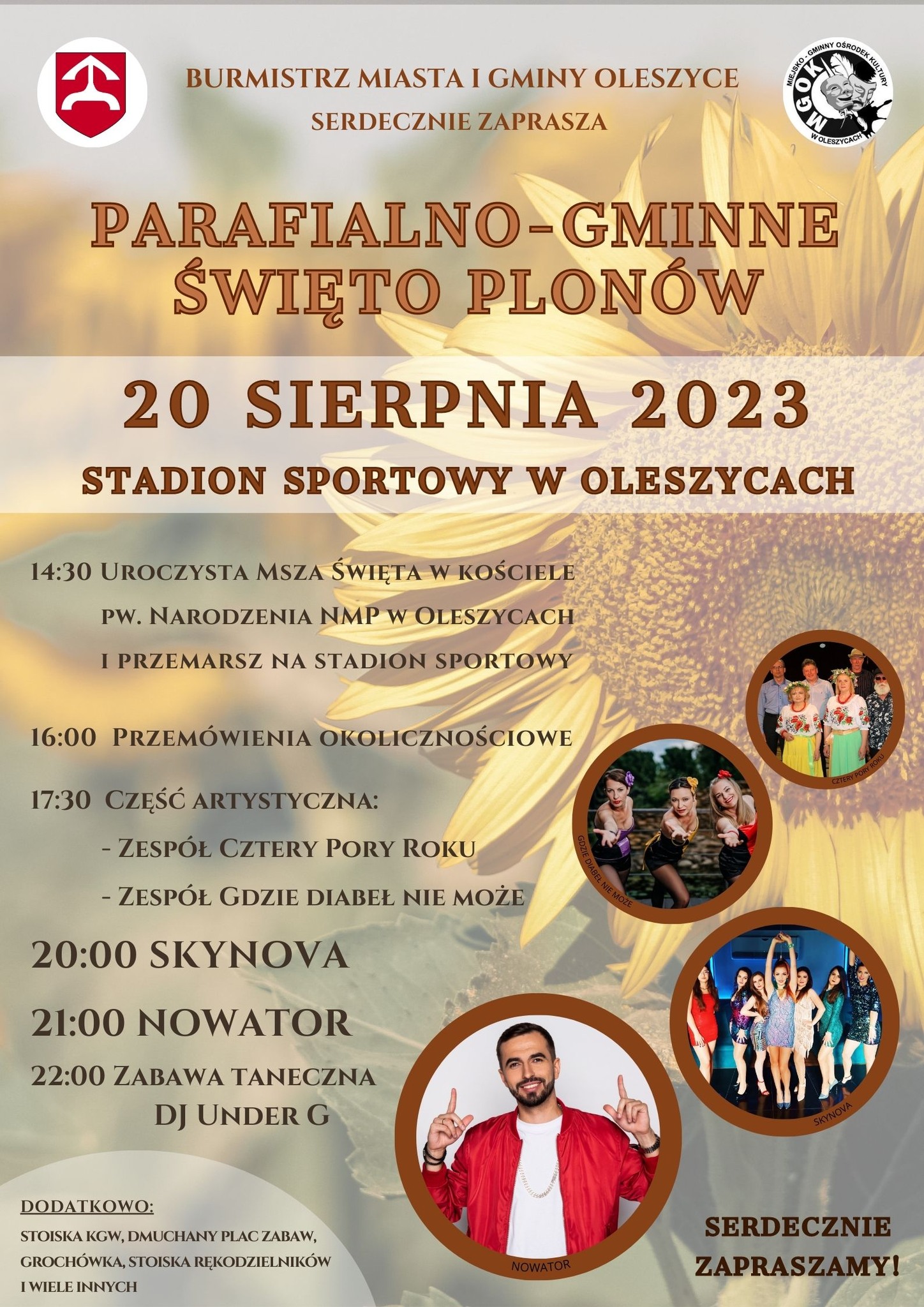 Poznaliśmy program tegorocznego Parafialno-Gminnego Święta Plonów w Oleszycach. Wydarzenie to odbędzie się 20 sierpnia. Na scenie wystąpią m.in. Skynova i Nowator, a wieczorem odbędzie się zabawa taneczna.