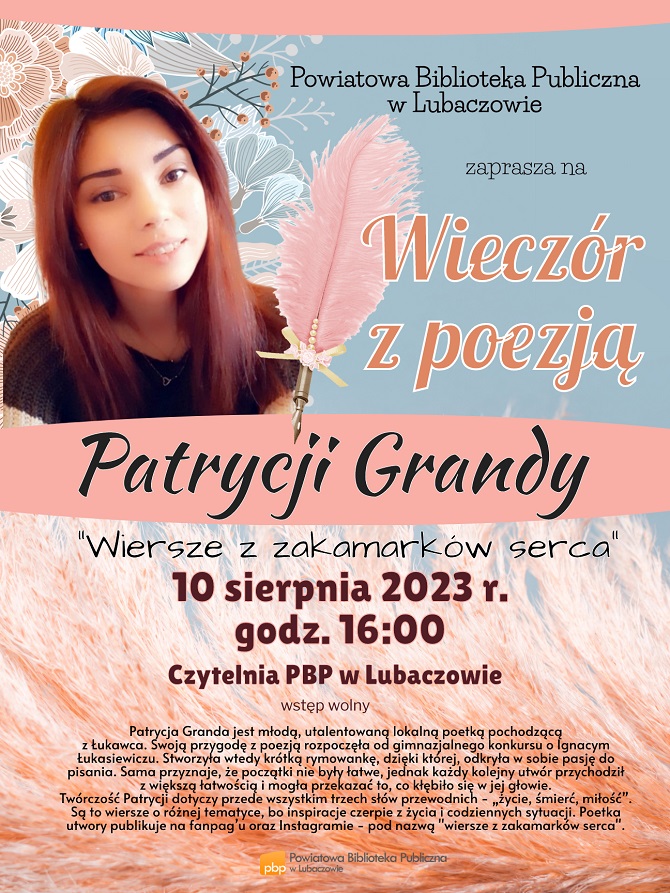 Podczas wydarzenia swoją twórczość zaprezentuje Patrycja Granda - młoda, utalentowana poetka pochodząca z Łukawca.