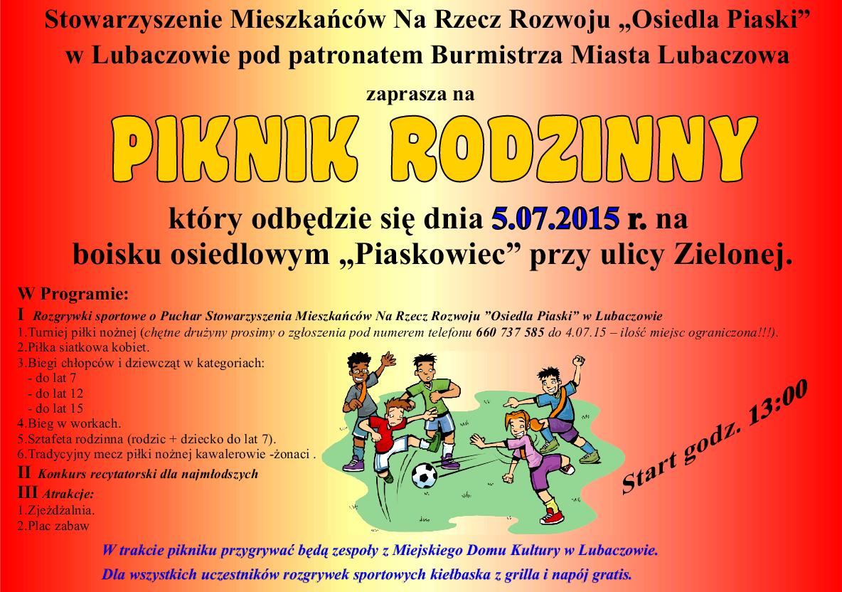 5 lipca w niedzielę na boisku osiedlowym „Piaskowiec” przy ulicy Zielonej odbędzie się „Piknik Rodzinny”. W programie między innymi turnieje piłki nożnej, siatkówki i biegi.