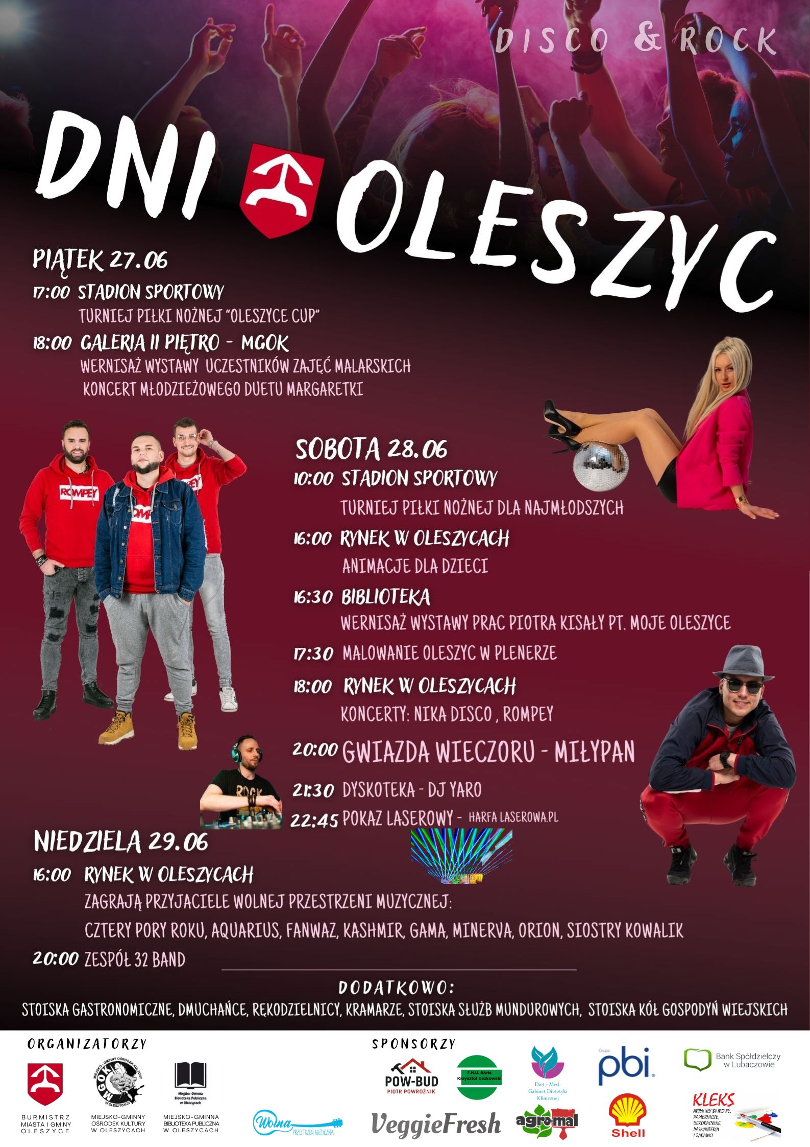 W sobotę 28 czerwca, od godz. 16:00 na rynku w Oleszycach zaplanowano animacje dla dzieci, a następnie pokazy taneczne zespołów z terenu miasta i gminy. O godz. 18:00 wystąpi Nika Disco, po nim o godz. 19:00 Rompey, a o godz. 20:00 – Miły Pan. Wieczór zakończy się dyskoteką z DJ-em Yaro oraz pokazami laserowymi.