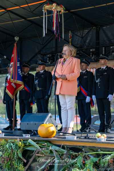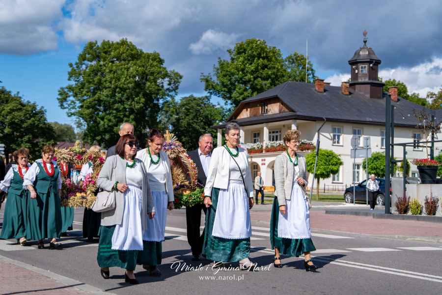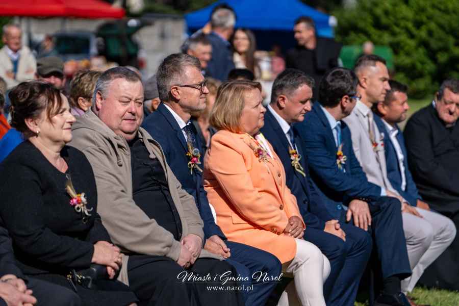 Następnie barwny korowód dożynkowy prowadzony przez Kapelę Galicjanie przeszedł na stadion miejski, gdzie odbyła się część oficjalna. Mieszkańców i gości powitali organizatorzy, a przemówienia wygłosili Burmistrz Miasta i Gminy Narol Arkadiusz Mroczek oraz Starosta Lubaczowski Barbara Broź. Burmistrz podkreślił znaczenie pracy rolników i stojące przed nimi wyzwania związane z pogodą i rynkiem, a starosta nawiązała do homilii, przywołując wspomnienia z rodzinnego domu i pracy rodziców na roli.