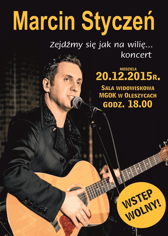 W najbliższą niedzielę (20.12) o godzinie 18:00 w Miejsko-Gminnym Ośrodku Kultury w Oleszycach odbędzie się koncert "Zejdźmy się jak na wilię", w wykonaniu Marcina Stycznia. Wstęp wolny.