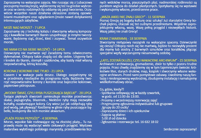 Jak co roku także i w te wakacje Muzeum Kresów w Lubaczowie zaprasza na wakacyjne zajęcia. Tegoroczne spotkania odbędą się po tytułem „Wakacje za jeden uśmiech” inspiracją będą oczywiście wystawy czasowe, gdzie Grecja oraz morskie pejzaże nieodrodnie z wakacjami się kojarzą. Przyjrzymy się także bliżej zabytkom z sal wystawowych oraz tych na co dzień „mieszkających” w magazynie.