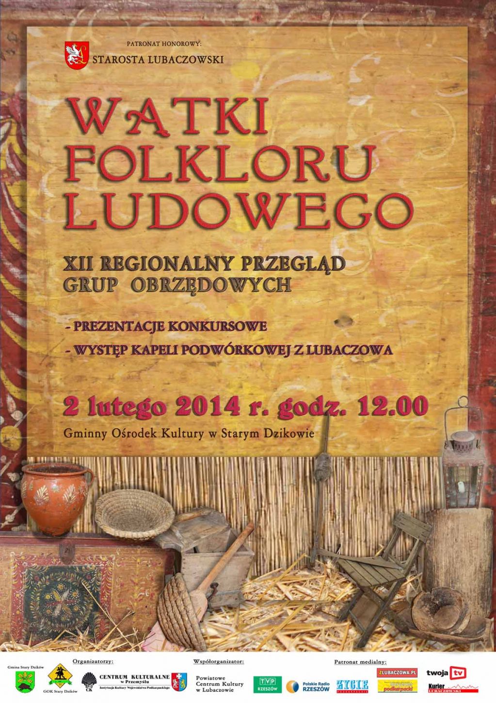 2 lutego o godz. 12.00 w Gminnym Ośrodku Kultury w Starym Dzikowie rozpocznie się XII Regionalny Przegląd Grup Obrzędowych "Wątki Folkloru Ludowego". Jego organizatorami są: Gmina Stary Dzików, Gminny Ośrodek Kultury w Starym Dzikowie, Centrum Kulturalne w Przemyślu, a współorganizatorem: Powiatowe Centrum Kultury w Lubaczowie.