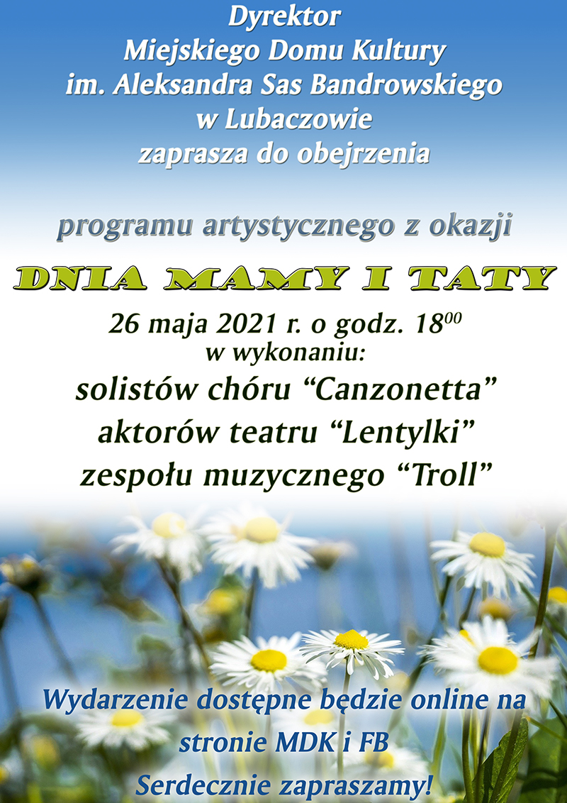 Dyrektor Miejskiego Domu Kultury w Lubaczowie zaprasza do objerzenia programu artystycznego z okazji Dnia Mamy i Taty. Początek we wtorek o godz. 18:00.