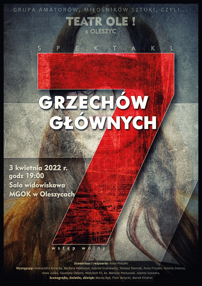 W niedzielę, 3. kwietnia, o godz. 19:00, w sali widowiskowej MGOK w Oleszycach po raz kolejny wystąpi Teatr Amatorski Ole! ze spektaklem "7 Grzechów Głównych".