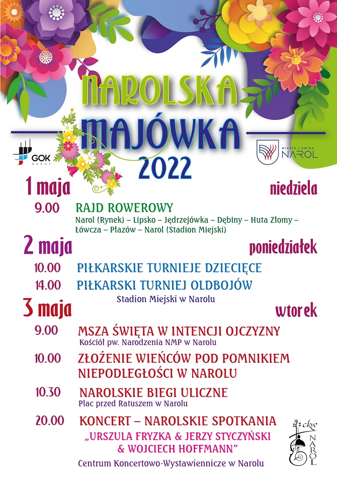 W tym roku proponujemy Państwu: rajd rowerowy, turnieje piłkarskie, uroczystości patriotyczne, biegi uliczne oraz koncert w Centrum Koncertowo-Wystawienniczym w Narolu. Ze względu na obecną sytuację na Ukrainie, program naszej trzy-dniowej imprezy został znacznie okrojony, mimo to zachęcamy serdecznie do udziału - na pewno będzie ciekawie. - zaprasza Urząd Miasta i Gminy Narol