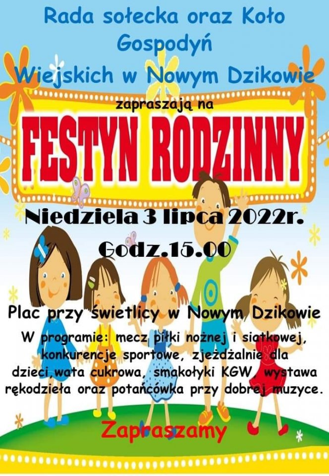Dzisiaj (03.07) na placu przy świetlicy w Nowym Dzikowie zorganizowany zostanie festyn rodzinny.
