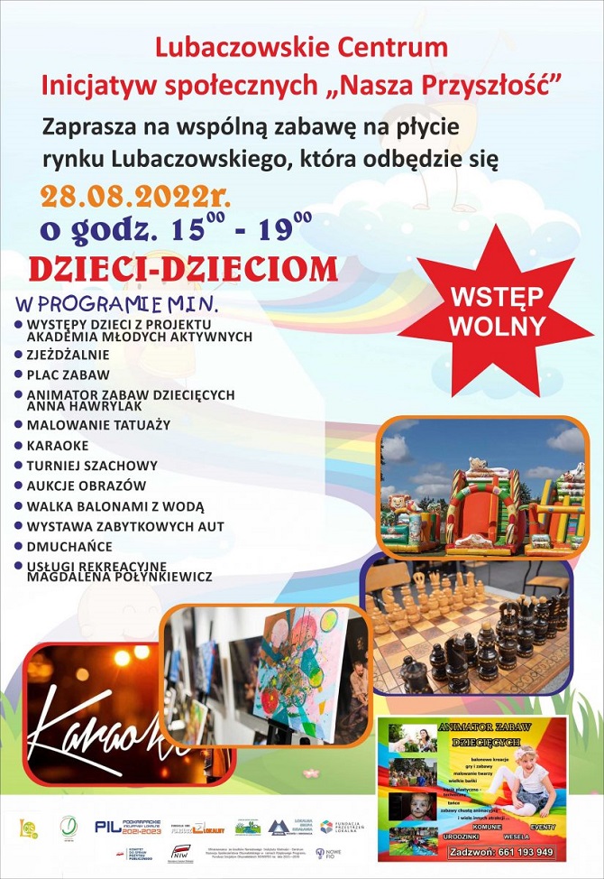 Lubaczowskie Centrum Inicjatyw Społecznych „Nasza Przyszłość” i trzy Grupy Inicjatywne już od 3 miesięcy realizują ciekawe projekty, w których bierze udział 70 dzieci. Wkrótce na lubaczowskim Rynku odbędzie się już kolejny piknik Dzieci – Dzieciom.