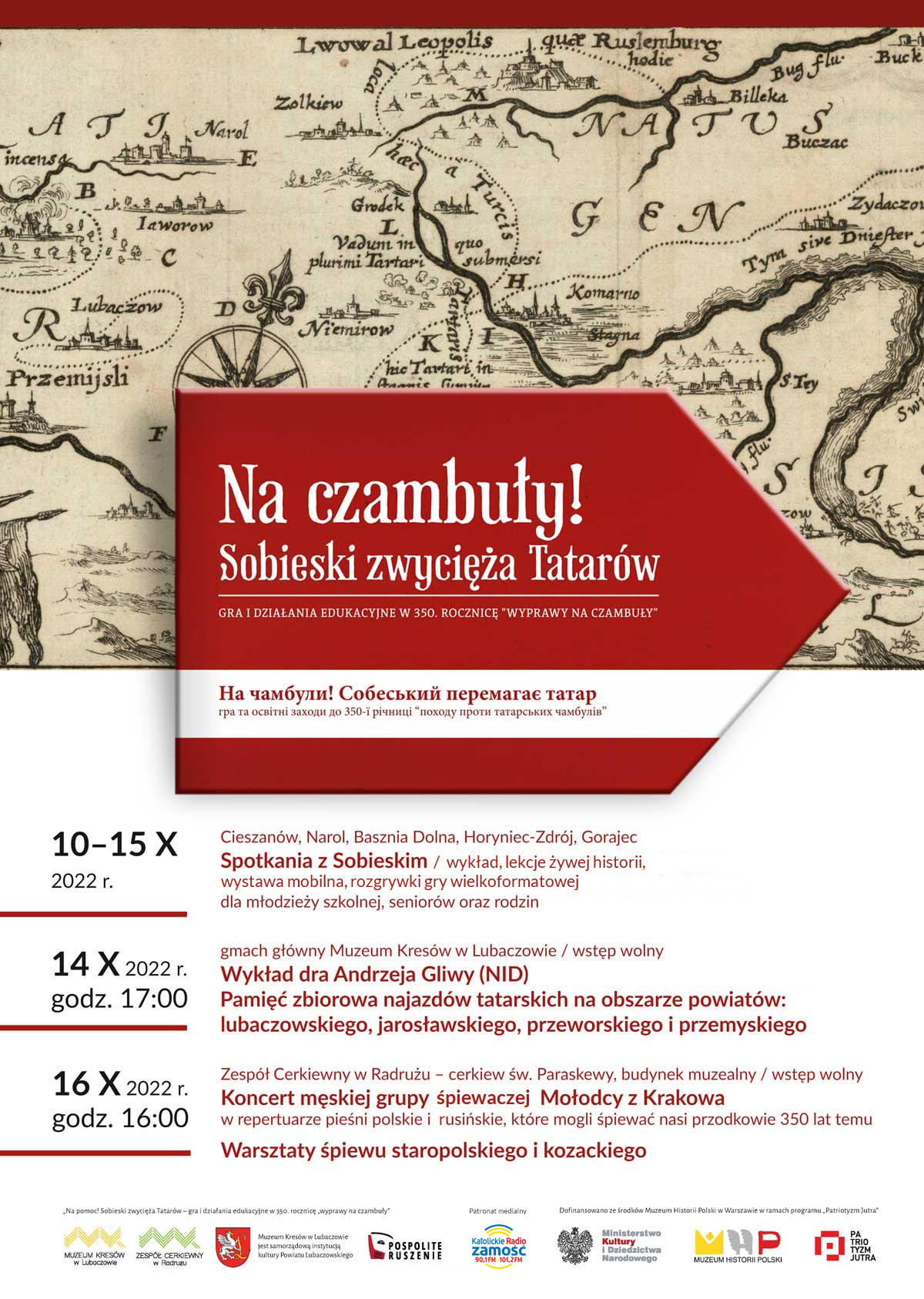 Składają się na nie zajęcia edukacyjne (wydarzenia o charakterze zamkniętym, odbywające się w szkołach oraz instytucjach kultury na terenie powiatu lubaczowskiego), a także wykład, koncert oraz warsztaty śpiewu, nawiązujące do czasów XVII-wiecznej Rzeczypospolitej. Realizacja wskazanych poniżej działań jest możliwa dzięki współpracy Muzeum Kresów ze stowarzyszeniem Pospolite Ruszenie oraz pozyskaniu wsparcia Muzeum Historii Polski w ramach programu „Patriotyzm Jutra” na projekt pt. „Na pomoc! Sobieski zwycięża Tatarów – gra i działania edukacyjne w 350. rocznicę wyprawy na czambuły”.