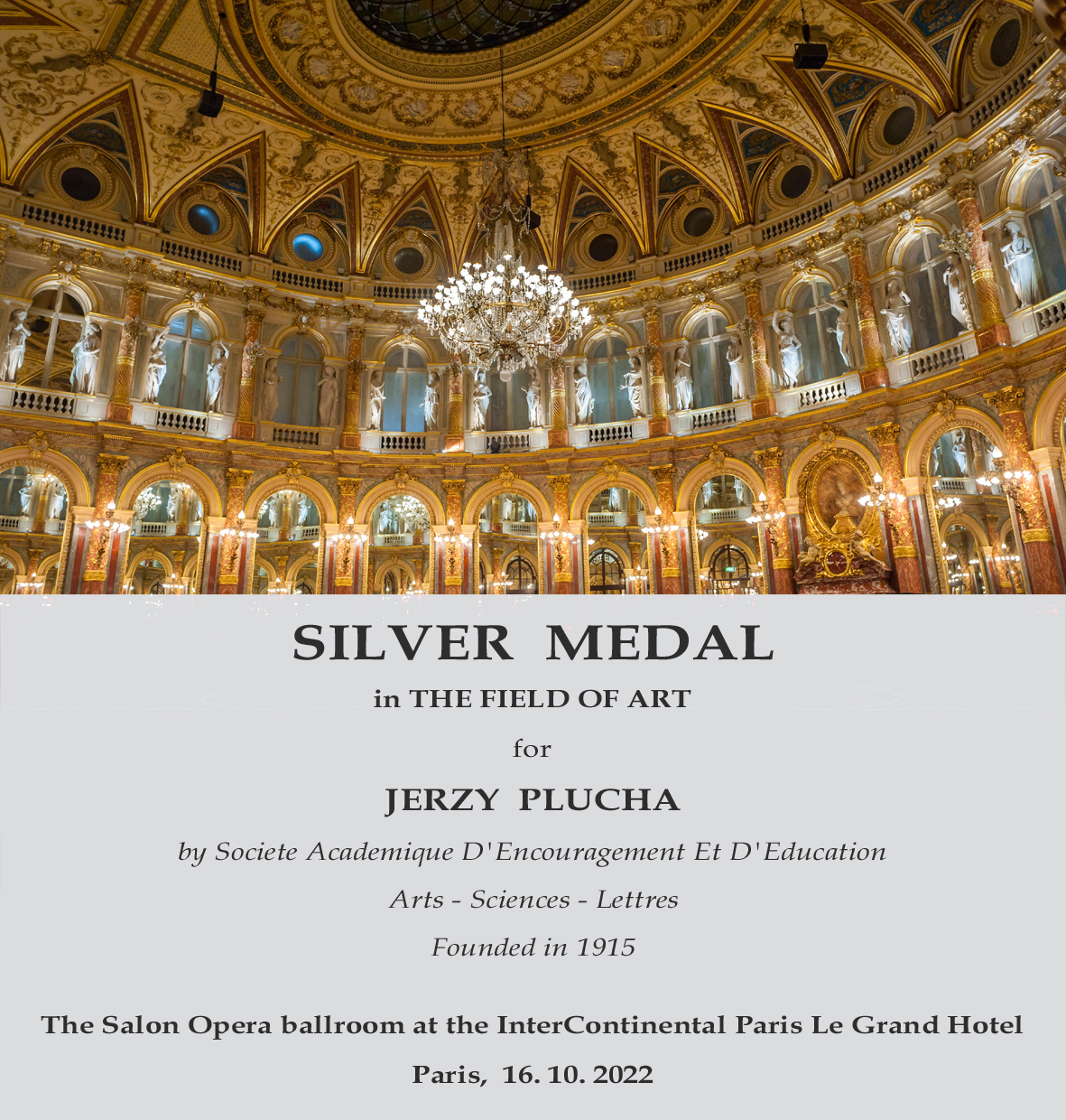 Lubaczowski artysta Jerzy Plucha otrzymał srebrny medal w dziedzinie sztuki. Uroczyste wręczenie nagród odbyło się 16 października Sali Balowej Opera Hotelu Le Grand InterContinental w Paryżu. Medal przyznało „Societe Academique D’Encouragement Et D’Education Arts – Sciences – Lettres”, które zostało założone we Francji w 1915 roku.