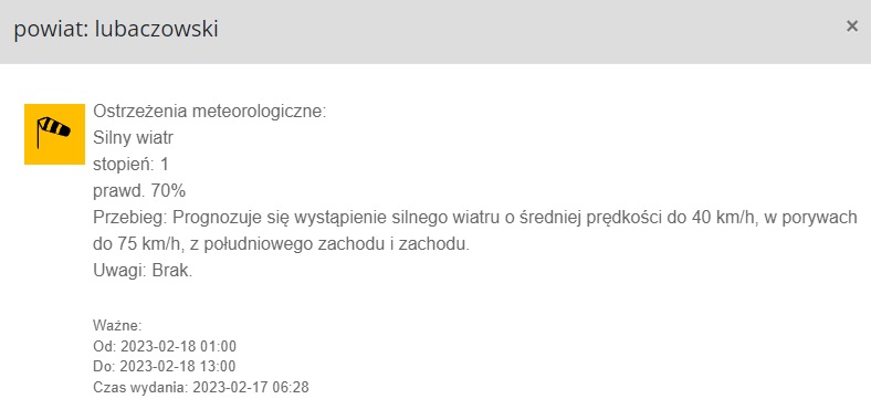 Ostrzeżenie jest ważne w sobotę (18.02) od godz. 01:00 do godz. 13:00.