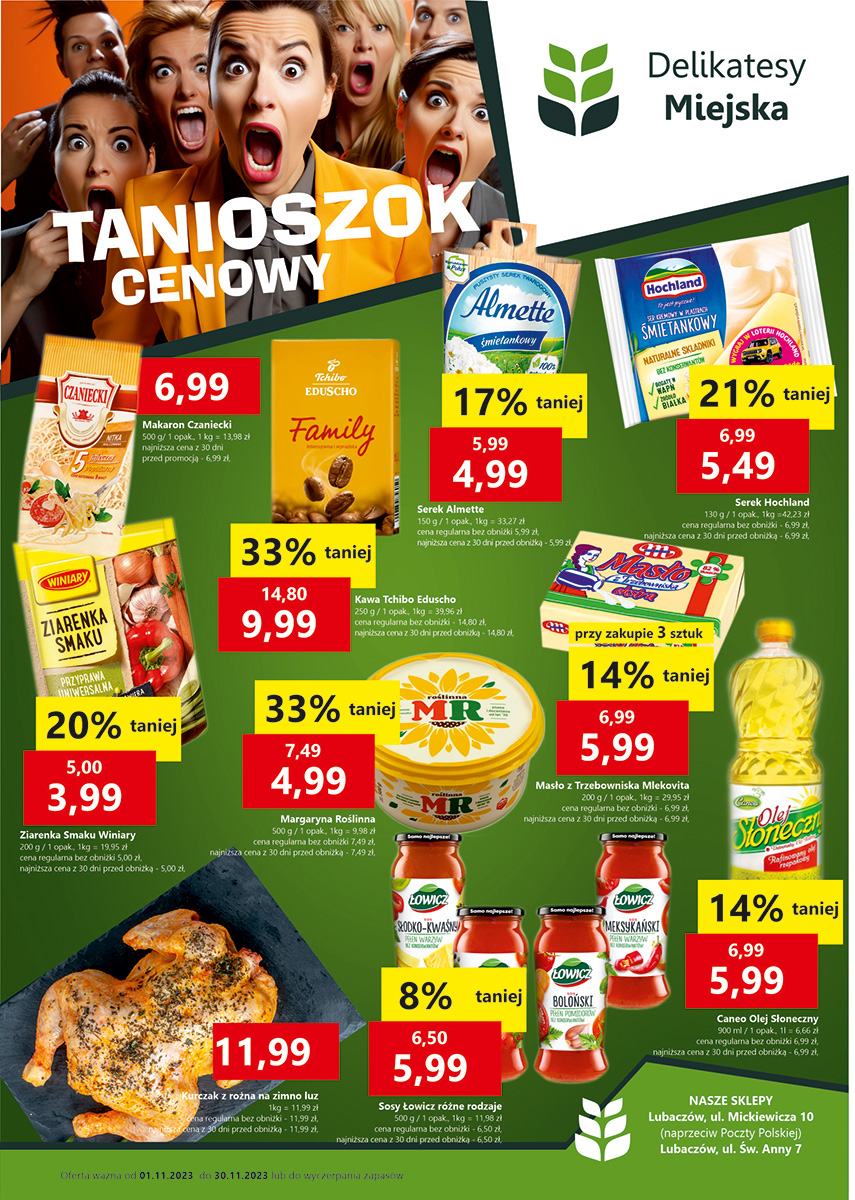 Poznaliśmy najnowsze promocje w Delikatesach Miejska. W okazyjnej cenie kupimy m.in. kurczak z różna czy margarynę Roślinną. Zakupy możecie zrobić w sklepach na ul. Mickiewicza 10 (naprzeciw Poczty Polskiej) oraz ul. Św. Anny 7 w Lubaczowie.