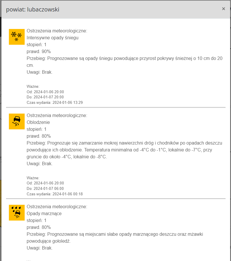 Prawdopodobieństwo wystąpienia zjawiska wynosi 90%. Stopień zagrożenia określono jako pierwszy.