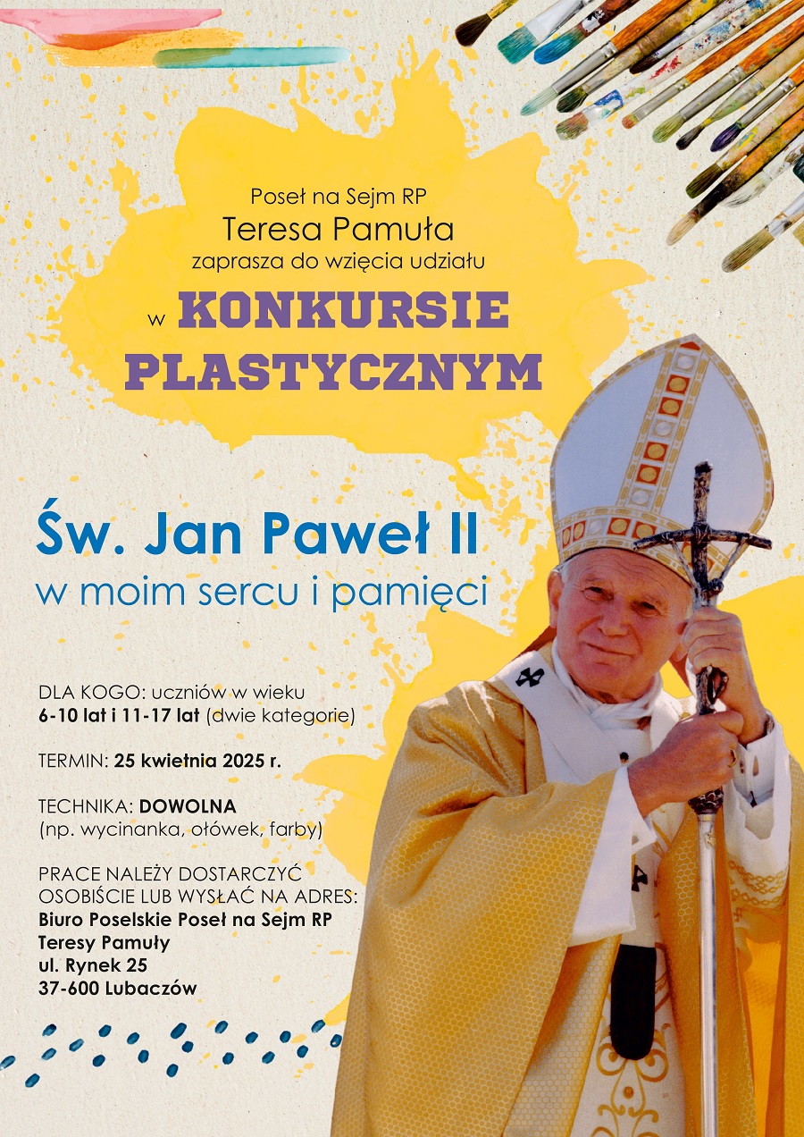 Poseł na Sejm RP Teresa Pamuła zaprasza dzieci i młodzież do udziału w konkursie plastycznym pod hasłem „Święty Jan Paweł II w moim sercu i pamięci”.