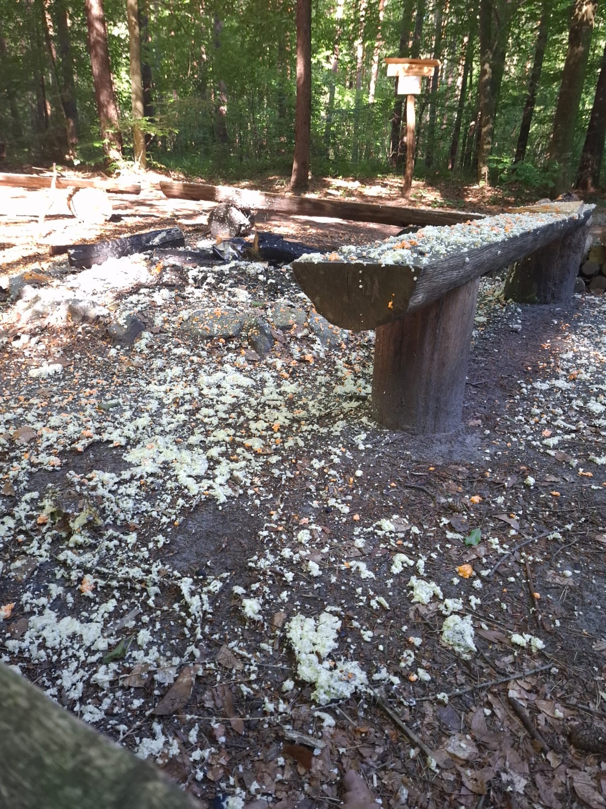 Na ścieżce edukacyjnej „Na Laszce”, przy przystanku Śródleśne Stawy, ktoś wrzucił do ogniska piankę montażową. Jak relacjonują leśnicy, „ławki, ognisko i cała okolica pokryte [zostały] chemikaliami”. Miejsce, które miało służyć rodzinom, klasom szkolnym i turystom szukającym chwili ciszy w lesie, zostało zabrudzone i zniszczone.