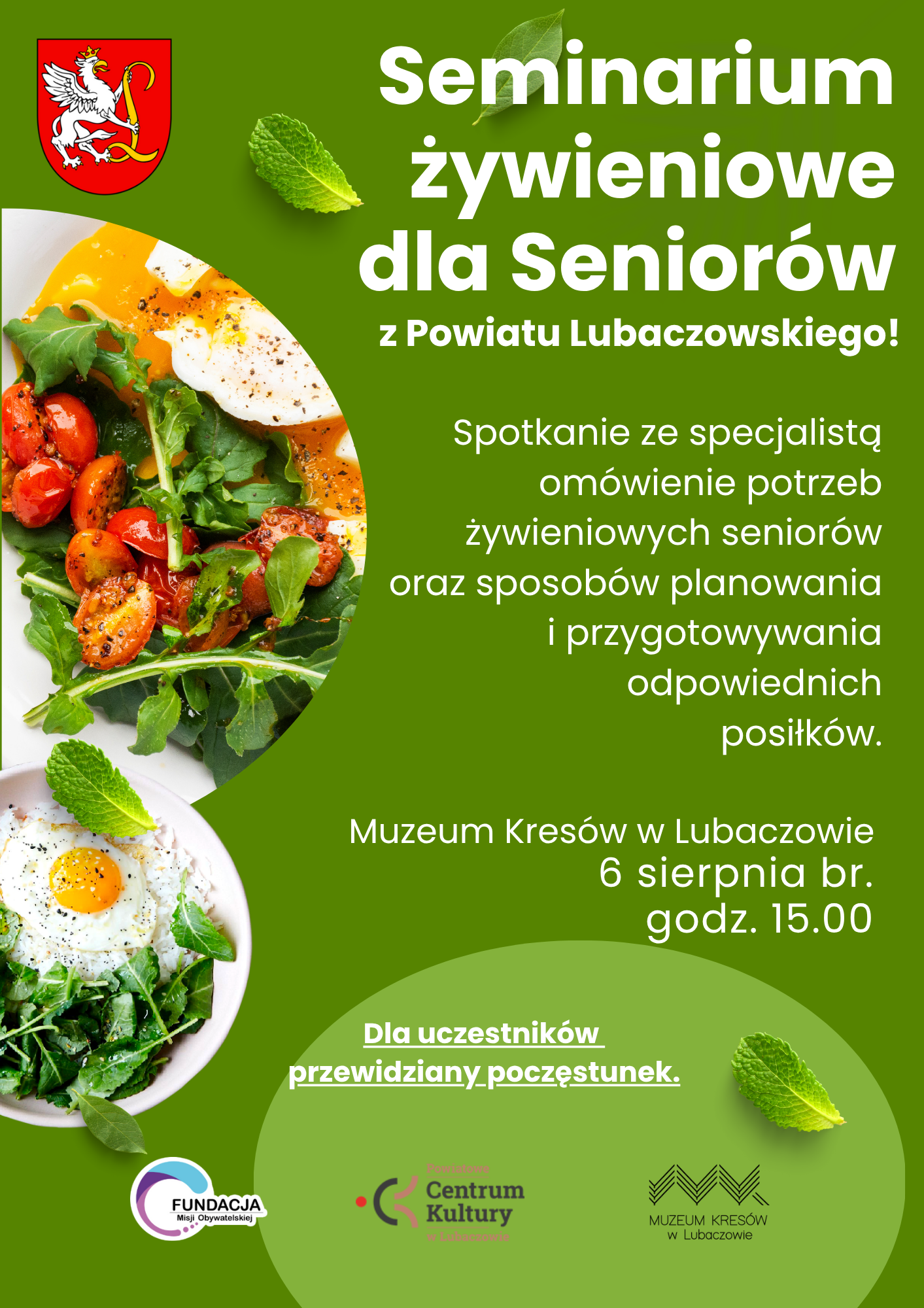 Wspólna rozmowa ze specjalistą, praktyczne wskazówki i zdrowy poczęstunek – to wszystko czeka na uczestników seminarium żywieniowego dla seniorów z powiatu lubaczowskiego. Spotkanie odbędzie się 6 sierpnia o godzinie 15:00 w Muzeum Kresów w Lubaczowie.