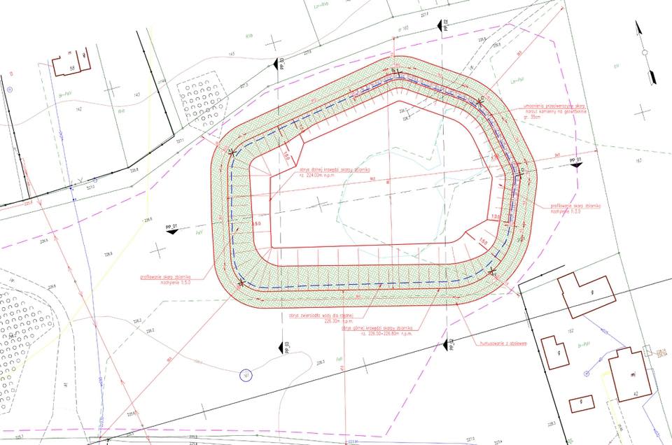 Projekt przewiduje m.in. głębienie czaszy zbiornika, profilowanie skarp, umocnienia przeciwerozyjne oraz obsiew terenu mieszankami traw. Skarpy zbiornika będą miały łagodne nachylenia, a część północna i wschodnia zostanie zabezpieczona narzutem kamiennym ułożonym na geowłókninie. Zbiornik napełniany będzie wyłącznie wodami spływającymi naturalnie z terenu przyległego. Jego zwierciadło wody ma utrzymywać się na stałym poziomie 226,30 m n.p.m.