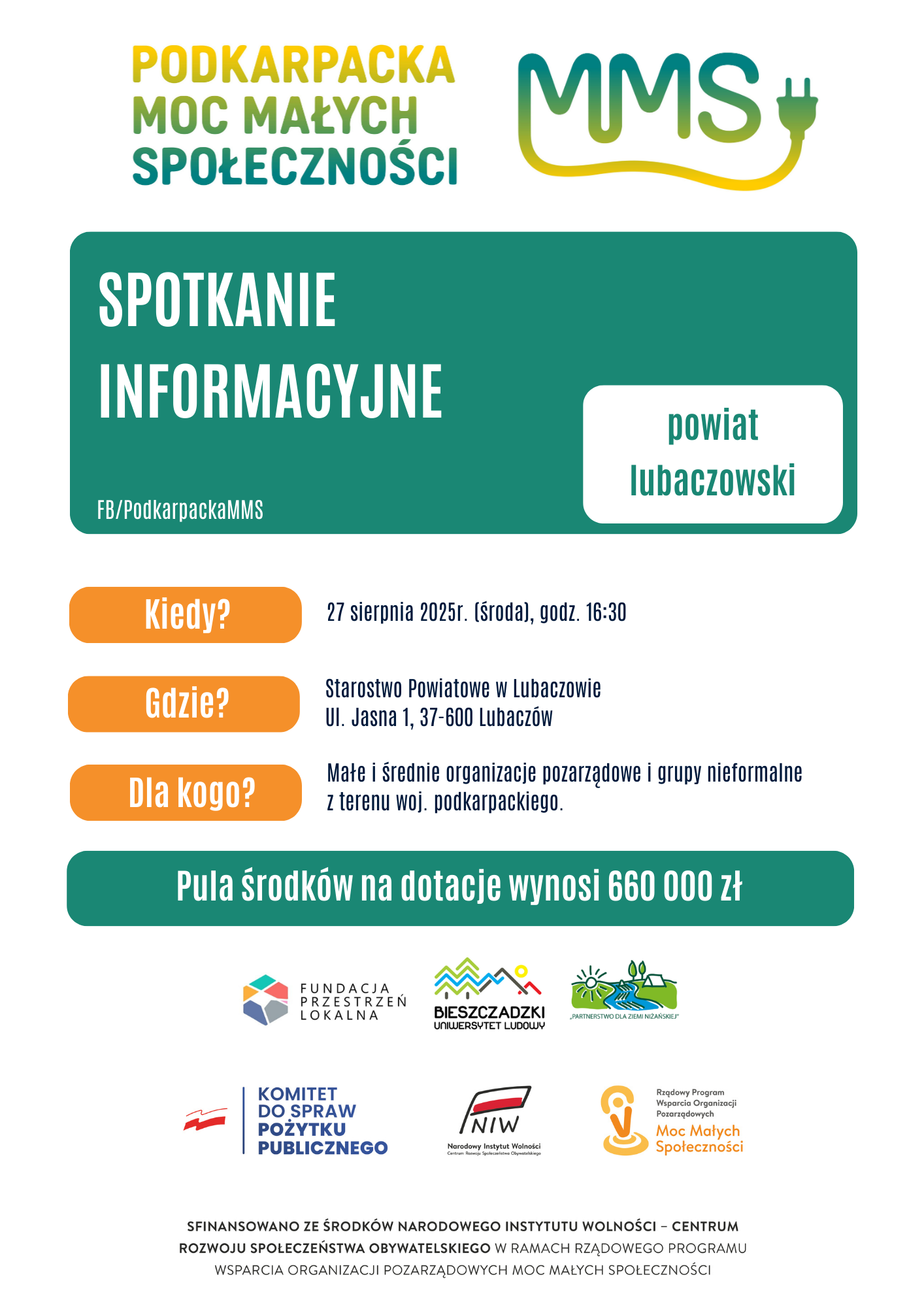 Małe społeczności mogą zyskać dużą szansę na rozwój. Już 27 sierpnia w Starostwie Powiatowym w Lubaczowie odbędzie się spotkanie informacyjne dotyczące projektu „Podkarpacka Moc Małych Społeczności – edycja 2025”, który umożliwia zdobycie nawet 10 tys. zł na lokalne inicjatywy i doposażenie organizacji.
