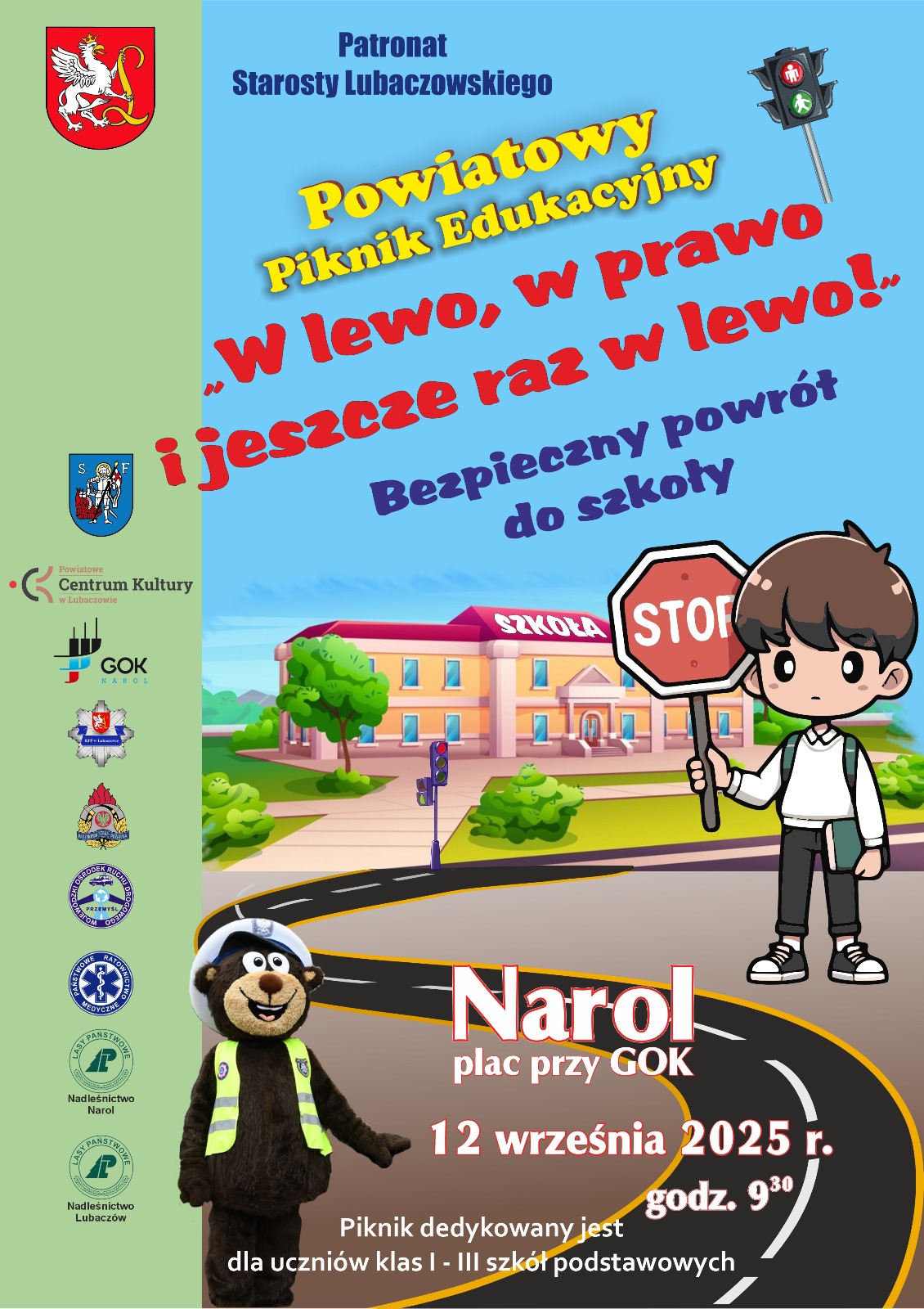 Już 12 września 2025 roku na placu przy Gminnym Ośrodku Kultury w Narolu odbędzie się Powiatowy Piknik Edukacyjny „W lewo, w prawo i jeszcze raz w lewo”. To wydarzenie skierowane jest do najmłodszych uczniów szkół podstawowych z powiatu lubaczowskiego – klas I–III.