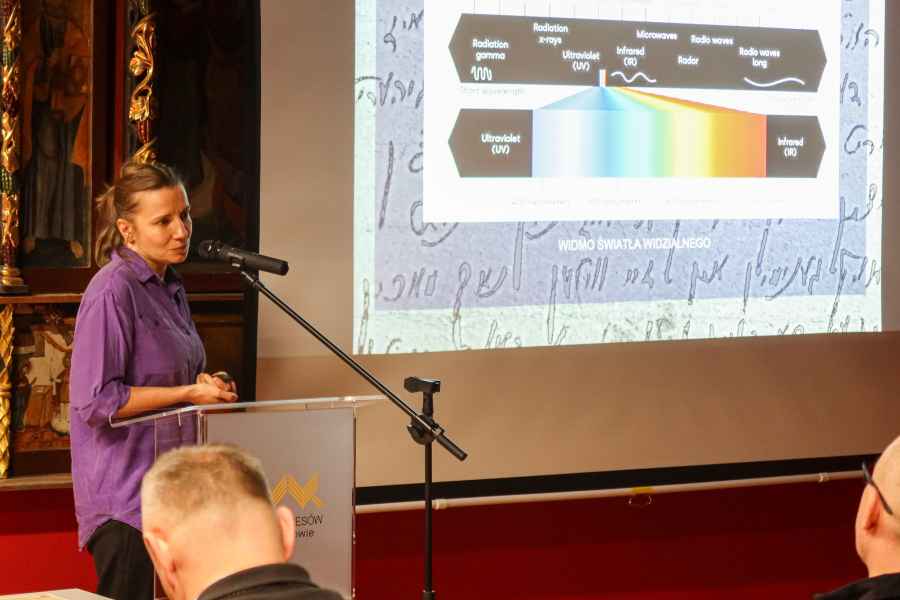 Agnieszka Marecka szczegółowo omówiła pierwszy etap prac konserwatorskich, prezentując stan zachowania obiektów w chwili odnalezienia. Judaiki były silnie zanieczyszczone gruzem i pyłem, miejscami zawilgocone, zaatakowane przez grzyby oraz poważnie nadwyrężone upływem czasu. W trakcie wykładu krok po kroku przedstawiono proces ich zabezpieczania i oczyszczania, a także efekty wykonanych zabiegów, ilustrując różnice pomiędzy stanem sprzed konserwacji i po jej zakończeniu.