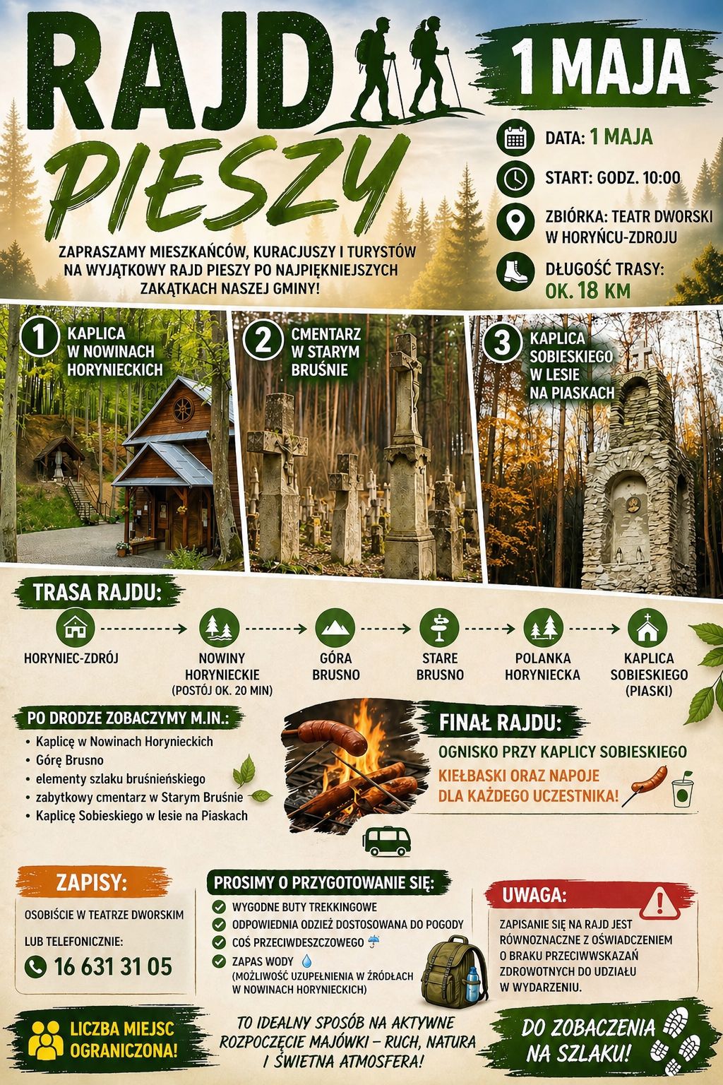 Rajd odbędzie się 1 maja. Uczestnicy wyruszą o godz. 10:00 spod Teatru Dworskiego w Horyńcu-Zdroju, gdzie zaplanowano zbiórkę. Do przejścia będzie około 18 kilometrów, dlatego organizatorzy zachęcają do wcześniejszego przygotowania odpowiedniego obuwia i odzieży.