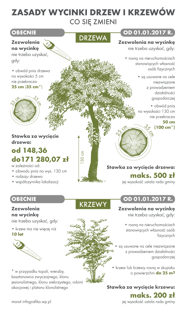 Obecnie przepisy wymagają wystąpienia do burmistrza (wójta, prezydenta miasta) o zezwolenie na takie działanie. Nowe prawo obowiązywać będzie od 1. stycznia 2017 r. Zdaniem Ministerstwa Środowiska to ułatwienie dla osób fizycznych, bo usunięcie drzewa na własnej nieruchomości nie będzie wymagało biurokratycznych zabiegów. Nie będzie również potężnych kar za brak zezwolenia.
