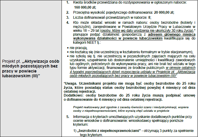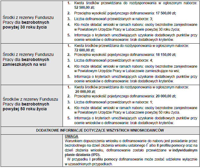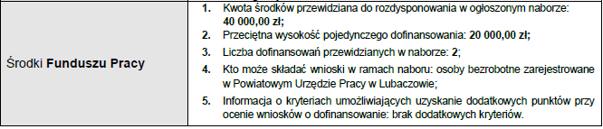 Szczegółowe informacje dotyczące kwalifikowania wniosków o dofinansowanie do konkursu można znaleźć na stronie internetowej urzędu: www.puplubaczow.pl.