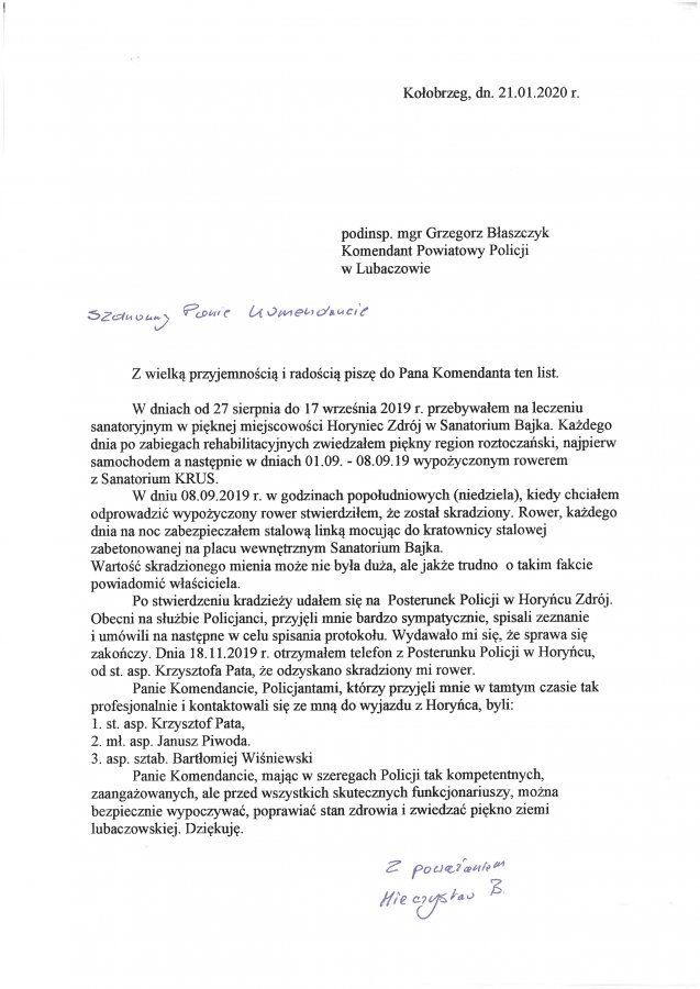 Na ręce Komendanta Powiatowego Policji w Lubaczowie wpłynęło pisemne podziękowanie od mieszkańca Kołobrzegu, w którym wyraził swoją wdzięczność i wyrazy uznania dla policjantów z Posterunku Policji w Horyńcu-Zdroju.