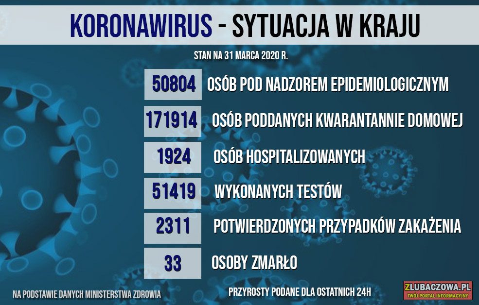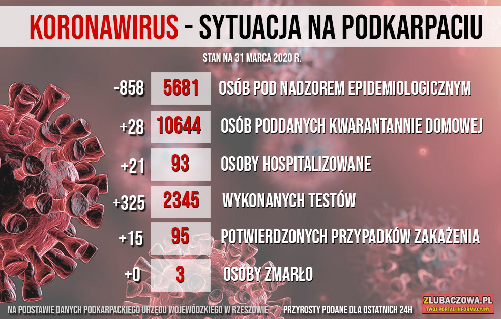 Według danych Wojewódzkiej Stacji Sanitarno-Epidemiologicznej w Rzeszowie na dzień dzisiejszy (31.03) 702 osoby objęte jest nadzorem epidemiologicznym (spadek o 65) natomiast 483 jest poddanych kwarantannie domowej (wzrost o 16). Do tej pory stwierdzono 2 przypadki zakażenia - u młodej kobiety z gminy Stary Dzików oraz mężczyzny w średnim w wieku z gminy Wielkie Oczy. Niestety zakażona 32-letnia kobieta z gminy Stary Dzików zmarła w poniedziałek w szpitalu w Łańcucie.