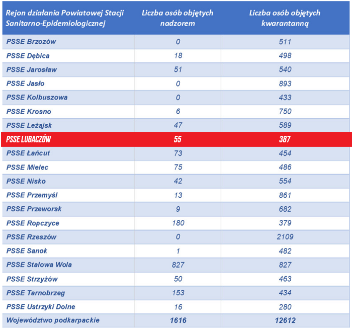 Według danych Wojewódzkiej Stacji Sanitarno-Epidemiologicznej w Rzeszowie na dzień dzisiejszy (06.04) 55 osób objętych jest nadzorem epidemiologicznym (spadek o 4) natomiast 387 jest poddanych kwarantannie domowej (wzrost o 6). Do tej pory stwierdzono 2 przypadki zakażenia - u młodej kobiety z gminy Stary Dzików oraz mężczyzny w średnim w wieku z gminy Wielkie Oczy. Niestety zakażona 32-letnia kobieta z gminy Stary Dzików zmarła w poniedziałek w szpitalu w Łańcucie.