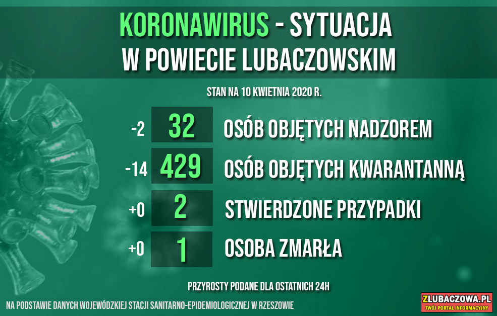 Według danych Wojewódzkiej Stacji Sanitarno-Epidemiologicznej w Rzeszowie na dzień dzisiejszy (10.04) 32 osoby objęte jest nadzorem epidemiologicznym (spadek o 2) natomiast 429 jest poddanych kwarantannie domowej (spadek o 14). Do tej pory stwierdzono 2 przypadki zakażenia - u młodej kobiety z gminy Stary Dzików oraz mężczyzny w średnim w wieku z gminy Wielkie Oczy. Niestety zakażona 32-letnia kobieta z gminy Stary Dzików zmarła 30 marca w szpitalu w Łańcucie.