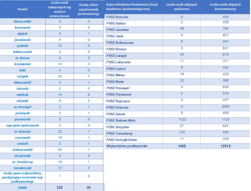 Według danych Wojewódzkiej Stacji Sanitarno-Epidemiologicznej w Rzeszowie na dzień dzisiejszy (13.04) 11 osób objętych jest nadzorem epidemiologicznym (bez zmian) natomiast 371 jest poddanych kwarantannie domowej (spadek o 29). Do tej pory stwierdzono 2 przypadki zakażenia - u młodej kobiety z gminy Stary Dzików oraz mężczyzny w średnim w wieku z gminy Wielkie Oczy. Niestety zakażona 32-letnia kobieta z gminy Stary Dzików zmarła 30 marca w szpitalu w Łańcucie. Dobra wiadomość jest taka, że wyzdrowiał mieszkaniec gminy Wielkie Oczy, który przebywał w szpitalu w Łańcucie. Zakażenie koronawirusem stwierdzono u mężczyzny 26 marca.
